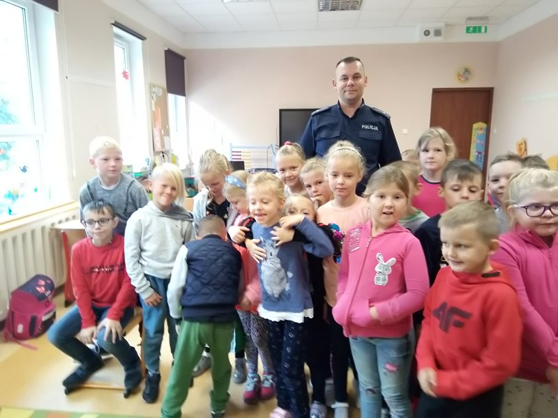 26 września młodsi uczniowie naszej szkoły wzięli udział w spotkaniu z policjantem. Spotkanie miało na celu zapoznanie dzieci z podstawowymi zasadami bezpieczeństwa w domu, w szkole i na drodze. Uczestniczące w spotkaniu dzieci miały okazję porozmawiać z naszym gościem nie tylko o bezpieczeństwie, ale również bliżej poznać pracę policjanta. Dzieci z chęcią uczestniczyły w spotkaniu, dzieliły się swoimi doświadczeniami i zadawały bardzo dużo pytań. Dzięki uprzejmości naszego gościa, mogły również potrzymać kajdanki i choć chwilę poczuć ich ciężar. ;-)